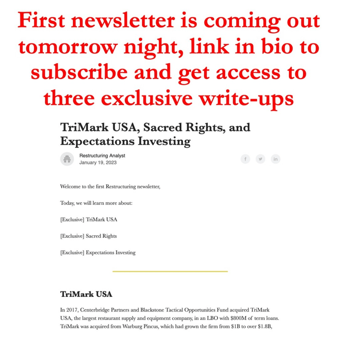 On January 19, 2023, I announced with the post below that I was launching the @Restructuring__ newsletter. My lack of creativity pushed me to ask my followers for name recommendations, and I received a brilliant suggestion which was love at first sight: Pari Passu was born.