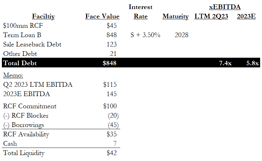 The next year painted a very similar picture for City Brewing: hard seltzer and craft beer demand continued to decline, and with it, the company’s operational performance. As facility utilization continued to fall, City Brewing struggled to shed fixed costs, and EBITDA continued to experience outsized declines. This strain became most evident in Q1 2023, when the company broke its 7.15x leverage covenant on its RCF, reporting leverage of 8.95x [10]. With ~$1,050mm of total debt (including leases and other debt), this implies LTM EBITDA of $117mm. With just $14mm of cash on hand, the company was forced to negotiate, and lenders agreed to waive the requirement through Q4 2023.