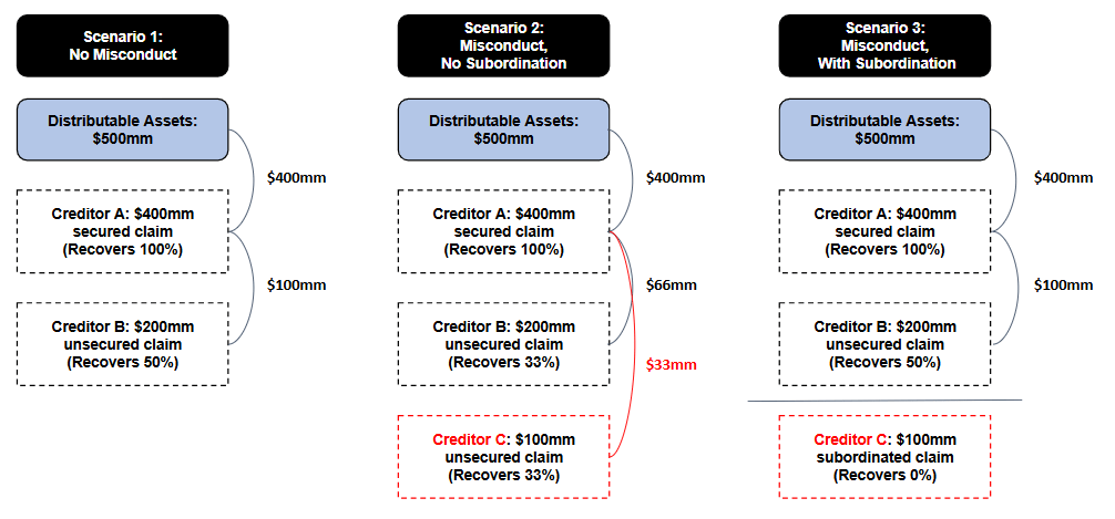 Scenario 3: Assume the same capital structure and misconduct as scenario 2. However, this time, the court decided that Creditor C’s wrongdoing passed the three-part Mobile Steel test. The court chooses to subordinate all of Creditor C’s claims. Under this scenario, Creditor A recovers 100%, and Creditor B recovers 50%, which are the same recoveries had Creditor C not engaged in predatory self-dealing. In this case, Creditor C receives zero recovery.