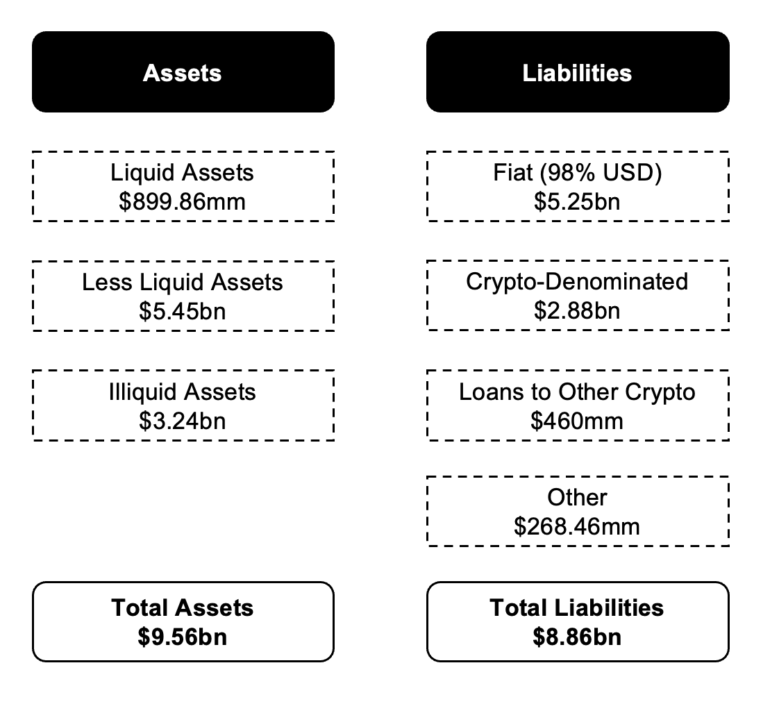 On the assets side, customer deposits in crypto tokens were not recorded on the balance sheet. As a result, on the liabilities side, the balance sheet did not reflect loan payables to many other customer accounts and third parties (blue, red, grey boxes in Figure 2 below), resulting in an estimated range of true assets and liabilities between $10bn and $50bn.