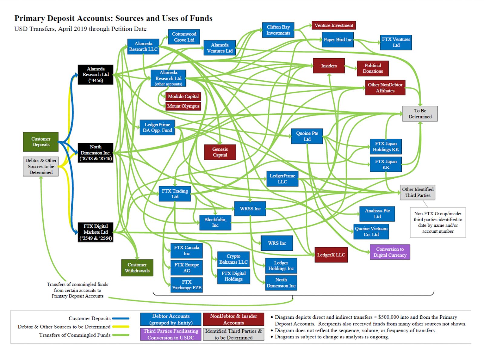 Without clear intercompany loans between subsidiaries, assets and liabilities traveled through different entities without proper records. The graphic below may look complex, but there are a few main avenues where the $10bn of customer deposits and corporate funds were ‘commingled’ by SBF and other directors, meaning they were used for unrelated purposes.