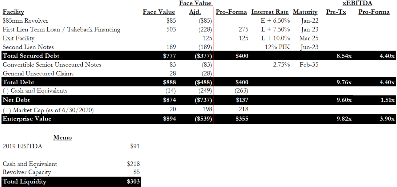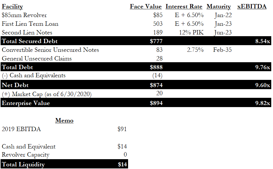 Q2 2020 revenue nearly halved to $83mm from $144mm in Q1 of 2020, and by the end of June, the company had already burned through the entire revolver draw and the majority of cash on hand. With a $22mm interest expense each quarter, a Chapter 11 filing seemed inevitable for the company, and it began discussing with lenders in Q2.