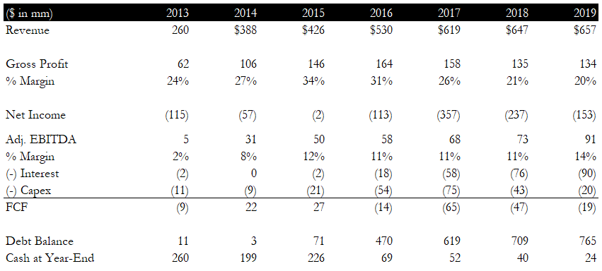 From 2015 to 2017, total revenue grew from $426mm to $619mm while EBITDA grew from $50mm to $68mm, representing 12% and 11% margins respectively. From 2015 to 2017, debt increased from $71mm to $619mm, reflecting the assumption of EMC’s debt and the subsequent refinancing into the aforementioned 2017 facility. As a result of this increase, interest expense increased from just $2mm in 2015 to $58mm in 2017 [3]. While the EMC acquisition contributed to top-line and EBITDA growth, the incremental profits were not enough to justify the added interest burden. This mismatch materially increased cash burn and strained GEE’s ability to fund its operations. The table below provides a high-level overview of GEE’s financial profile from 2013 to 2019.