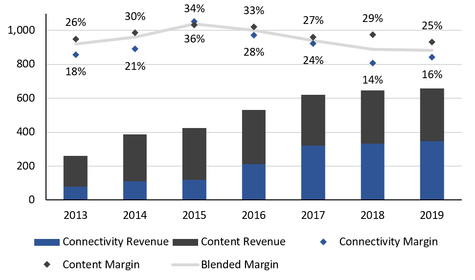 From 2013 to 2017, revenue grew at a CAGR of 24%, with the majority of this growth being driven by the connectivity segment. For reference, the content segment grew at 13% from $182mm to $277mm over this period, while the connectivity segment grew at a CAGR of 42% from $78mm to $321mm in 2017, surpassing the size of the content segment. This reflects the growing demand for in-flight connectivity during the mid-2010s [3].