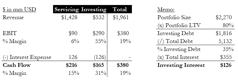 Servicing, alongside portfolio investing, enables Intrum to offer a broad credit management solution. For context, as of 2024, investing accounted for $532mm (30%) of total revenue while servicing accounted for $1.42bn (70%). In terms of EBIT, which is management’s only breakout of segment profitability, Investing generated $290mm while servicing generated $90mm. These represent 55% and 6% margins, respectively, a substantial difference between segments. However, reported EBIT distorts segment profitability because it ignores the interest expense associated with leveraged acquisitions, as all interest is deducted as a servicing expense. In reality, a substantial portion of Intrum’s interest expense is associated with the debt from the levered portfolio acquisitions. Therefore, we’ve restated reported EBIT to account for Intrum’s estimated portfolio-associated interest, based on the company’s current portfolio size, making an assumption on the portfolio LTV in order to estimate how much debt (and interest) should be categorized as a cost in the Investing segment.
