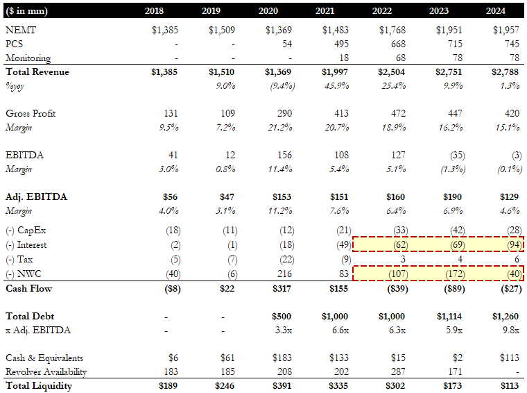 A parallel development in the industry resulted from regulatory changes. In 2021, the government passed the American Rescue Plan Act (ARPA), a $1.9tn stimulus funded through deficit spending, used for direct support checks, business aid, and, most importantly, insurance funding to help recover from COVID. A crucial provision in the act prohibited Medicaid from unenrolling members and from introducing more restrictive eligibility requirements between 2021 and 2023. This resulted in Medicaid enrollment peaking at 98.2 million members in 2023. However, the act began to expire gradually at the end of 2023, and enrollment declined in 2024, bringing the number of Medicaid members to 88.8 million. This was exactly the reason members covered by the ModivCare NEMT segment declined from 33.6 million in 2023 to 29.6 million in 2024. Declining enrollment and increasing utilization among the remaining members ultimately hurt ModivCare’s margins, with adjusted EBITDA decreasing from $190mm in 2023 to $129mm in 2024, a 33% decline. With ongoing contract working capital pressure and bloated interest payments, the company burned $29mm in cash in 2024. After fully drawing its revolver in Q4 2024, ModivCare had approximately $112mm in liquidity.