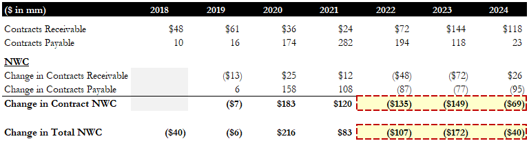 To give some context, when COVID shutdowns happened in 2020, non-emergency transportation utilization fell from 12.9% to 8%. Utilization in this case is calculated as Total Paid Trips/(Average Monthly Members * 12), which represents the average number of trips per member per year. Lower utilization benefited ModivCare since a member who takes no to very few trips earns ModivCare the same fixed monthly fee, directly increasing margin. In addition to lower utilization, lower fuel costs reduced ride costs, benefiting margins as well. However, since ModivCare’s margins were high, its profits exceeded the thresholds under the shared-risk capitated contracts, obligating ModivCare to record contract liabilities. In 2020, contracts payable increased by $158mm, and the trend continued in 2021, with contracts payable rising by $108mm to $282mm. This pile was effectively a guaranteed $282mm future cash outflow, as most of it would have to be paid off within the next year, either through cash payments or by offsetting earned profits.