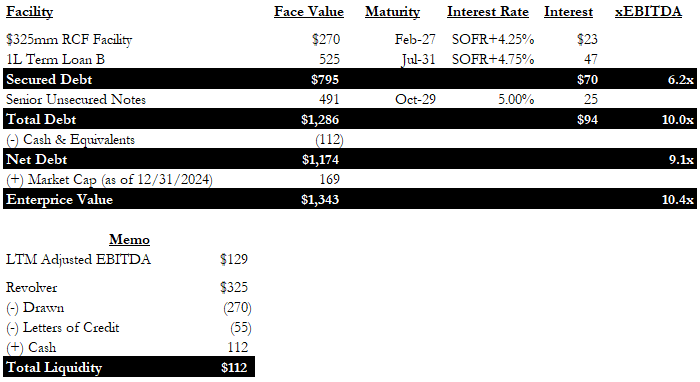 ModivCare knew things were not looking too good more than a year before filing, and it appointed Moelis and FTI in the second half of 2024 to explore strategic alternatives. The main concern was liquidity – as we mentioned, at the end of Q4 2024, ModivCare had only $112mm in liquidity. Approaching Q1 2025, the quarter which historically has the largest working capital outflow, the company was on its way to breaching its minimum liquidity covenant ($75mm) under its revolver credit agreement. There were no upcoming maturities, making the situation easier. However, since cash generation was out of sight, fresh capital was the only way to avoid filing in early 2025.