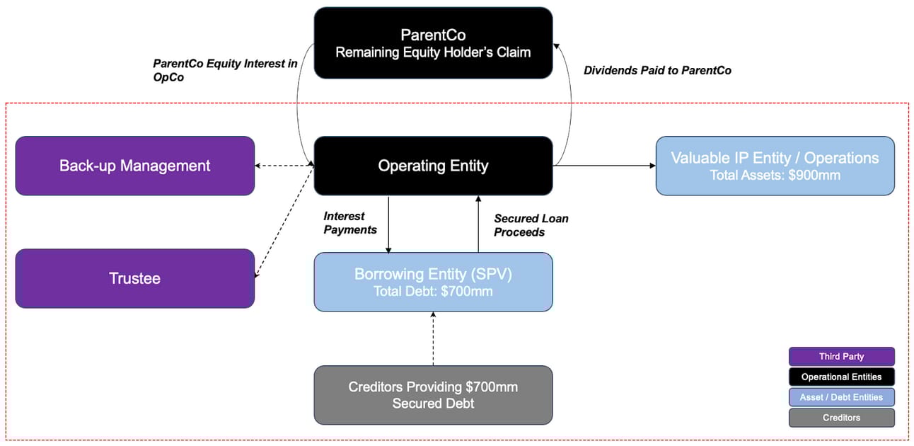 Outside the WBS, parent companies typically hold equity interest in the WBS, receiving dividends for profit. The operational assets, IP, and everything else within the WBS are bankruptcy remote from the parent. This means that if the parent company filed for Chapter 11, the operational assets and cash flow from the WBS are not accessible for recovery in the parent company’s filing and are not considered part of the bankruptcy estate.