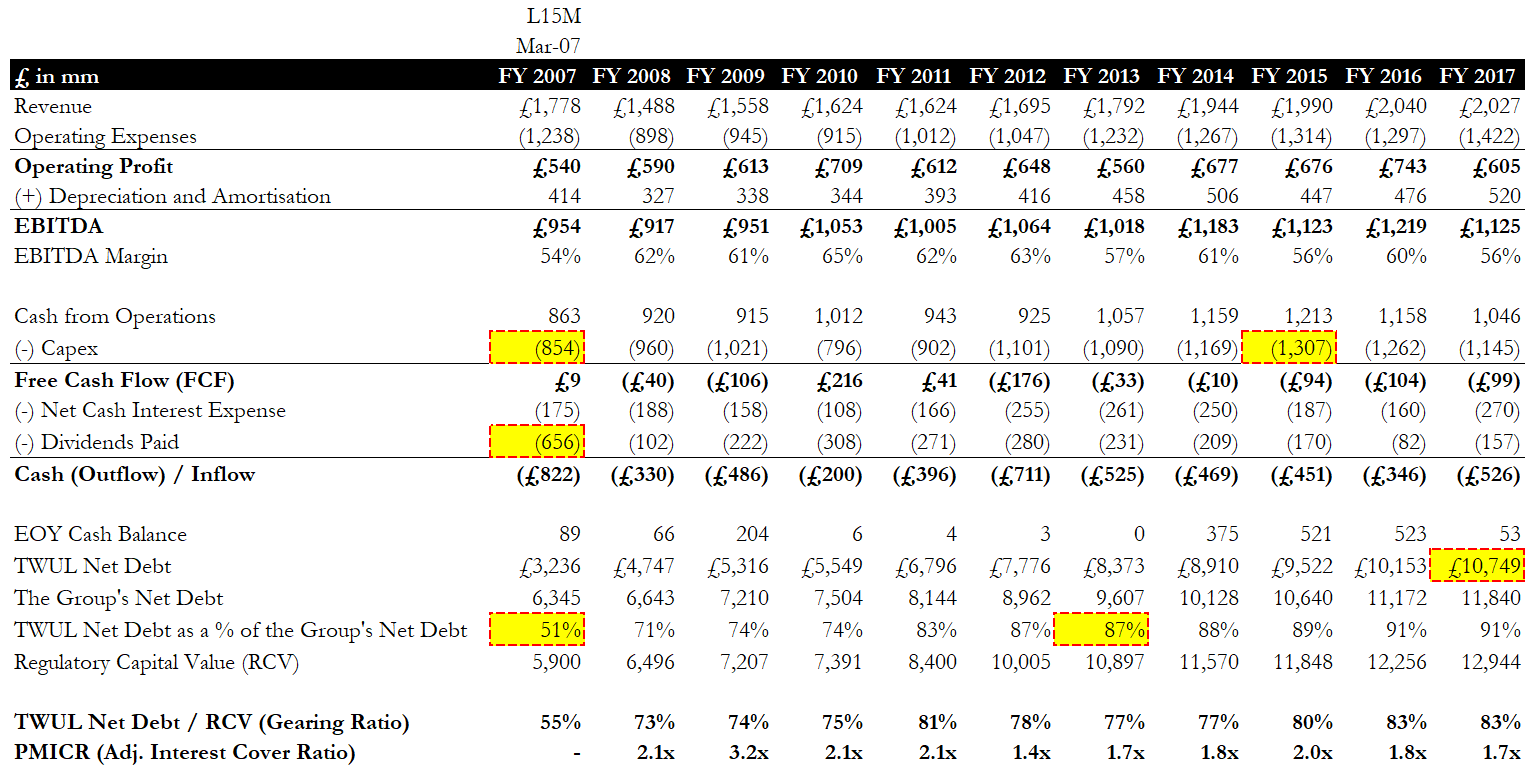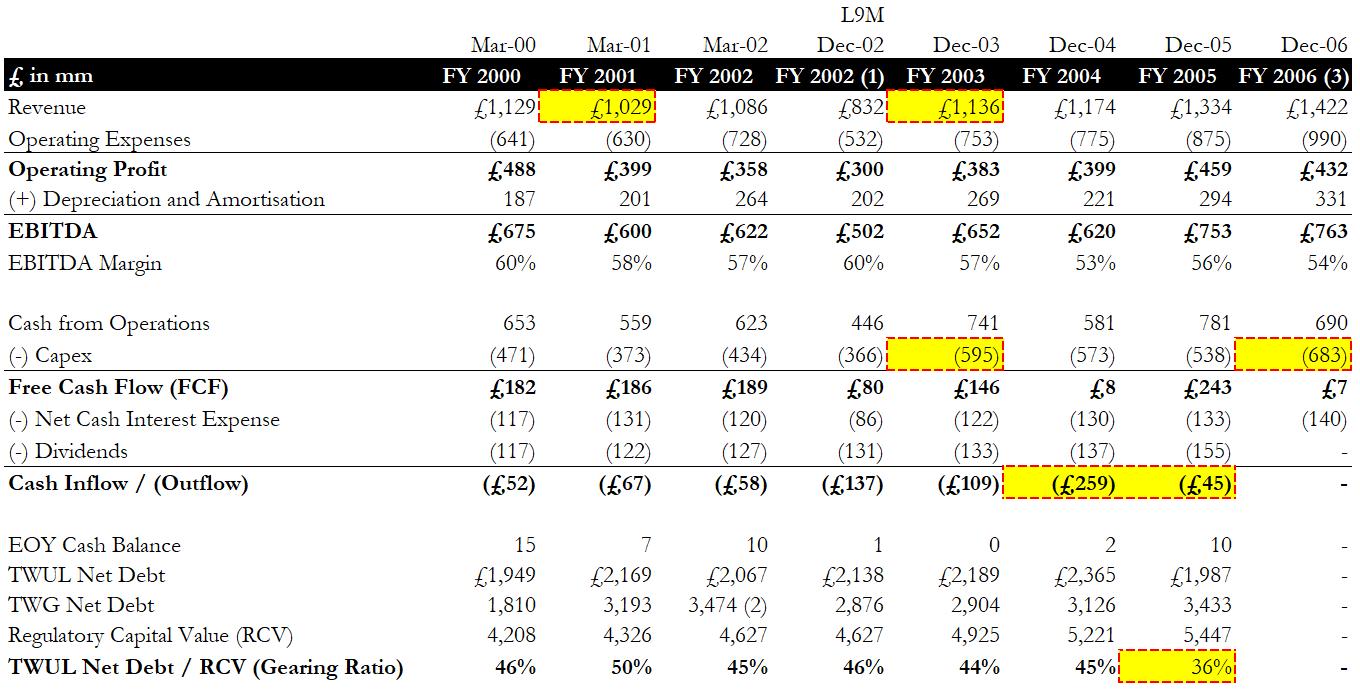 Figure 7: TWUL financial performance 2001 – 2006 [20] [21] TWUL is the operating company that is regulated / ringfenced Footnotes: (1) The line above the table shows when the FYs ended. In 2002, there was a shift to change the FY to a year ending 31st December from 31st March. | (2) This same shift to 31st December was done in 2001 for entities above TWUL. Hence, we don’t have The Group’s Net Debt for 03/31/2002 to provide a direct comparison; the figure we included is from 12/31/2001. | (3) There is no data for the year ending 12/31/2006; any financial data for FY2006 is based on our estimates.