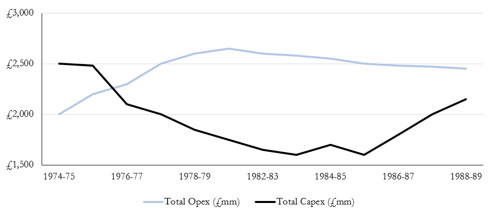 Figure 2: Operating expenditure and capital investment of the RWAs 1974-1989. Adjusted to 2003-04 prices [2]