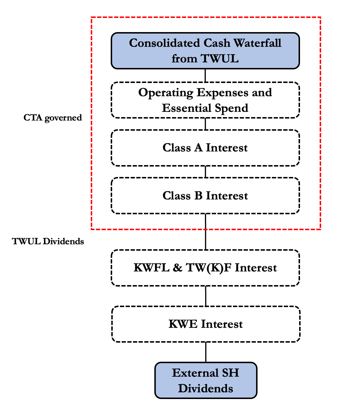 Senior Secured Term Loans (KWFL): Above the WBS sits Kemble Water Finance Limited (KWFL), which borrowed through senior secured term loans to finance the acquisition in 2006. Unlike the WBS debt, which has first call on TWUL’s revenues, these loans have no direct recourse to the operating company. They are only repaid if surplus cash flows upstream after the WBS has been satisfied. This means that, in practice, the Senior Secured Term Loans are structurally subordinated: if the WBS blocks dividends, KWFL’s lenders have no recourse to the operating company.