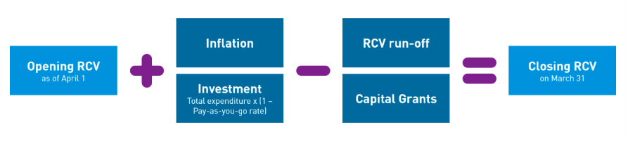 RCV (Regulatory Capital Value): the regulator’s running total of the assets customers are paying for. It grows when new spend is added; it shrinks through an RCV run-off (similar to depreciation).