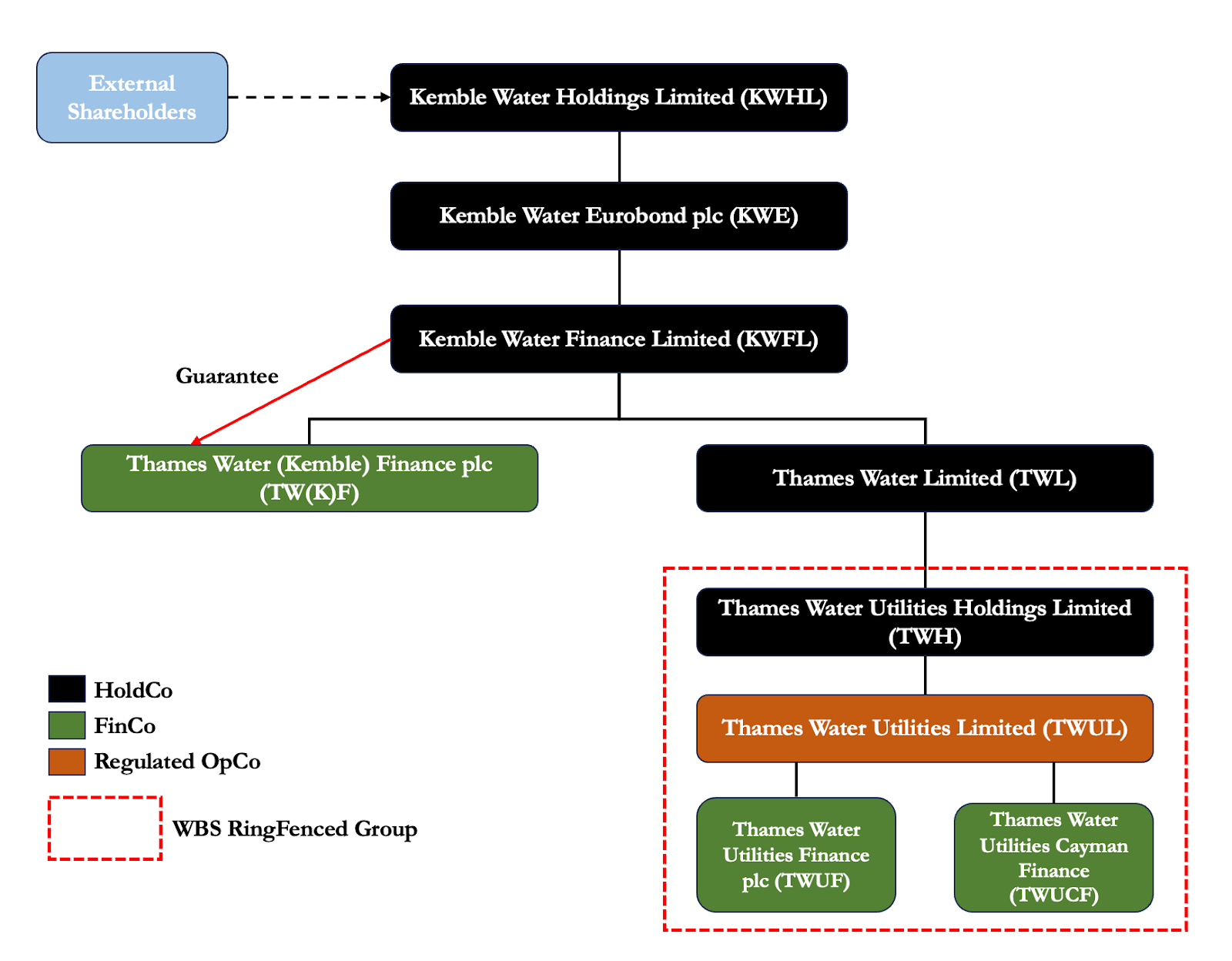 Thames Water (Kemble) Finance plc (TW(K)F): Financing arm immediately below KWFL. TW(K)F was actually set up later in 2011, and it issued senior secured bonds that were guaranteed by its direct parent, KWFL, which also holds 100% of shares in TWL.