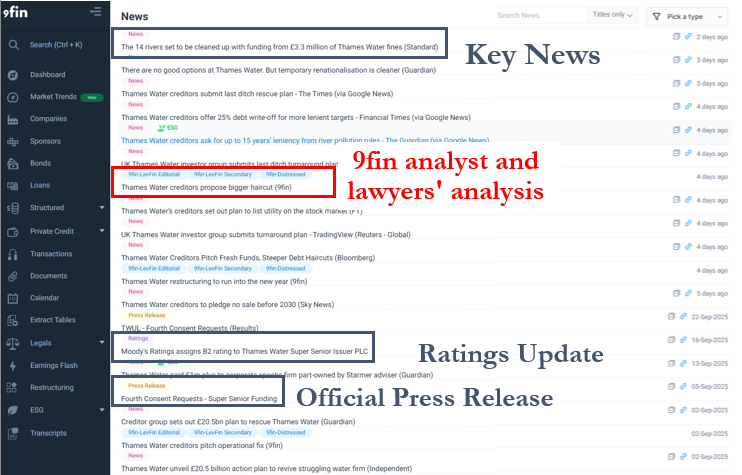 Having full access to 9fin was extremely helpful. You can see below how it works. After logging in, I have access to an Overview section where I can find a consolidated and chronological view of everything about Thames - from key news, to ratings updates, press releases, and most importantly, 9fin’s proprietary analysis, written by their team of experts. They also have a company page, which gives you loads of helpful info: what triggered the distress, a timeline with links to court docs, key stakeholders, and the cap table. Basically, everything you need to get up to speed in one place.