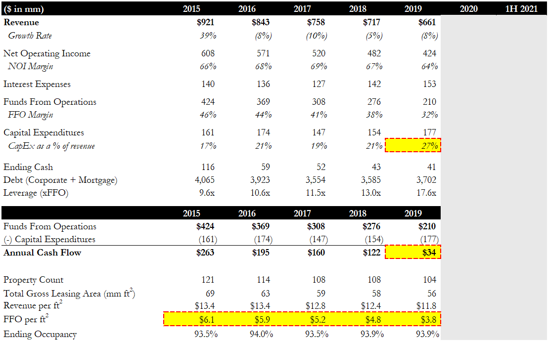 To make matters worse, WPG’s main cash outflow, capex (primarily maintenance, as the company was generally downsizing and not making significant acquisitions of new properties) stayed flat progressively making up a percentage of revenue given the ongoing decline (capex as a percentage of revenue peaked at 27% in 2019). In short, WPG was converting less of its declining revenues into profit, while simultaneously reinvesting more of that profit just to maintain operations. Annual cash flow nearly halved from $263mm in 2015 to $122mm in 2018, before falling to just $34mm in 2019.