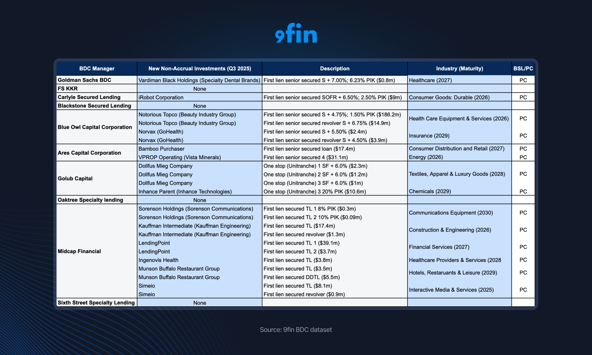This analysis represents the only systematic tracking of non-accrual trends across the industry, made possible by 9fin's unique dataset of 7,000+ BDC loan holdings. This data is presented in one searchable dataset, delivering comparable performance insights previously impossible to obtain at scale.